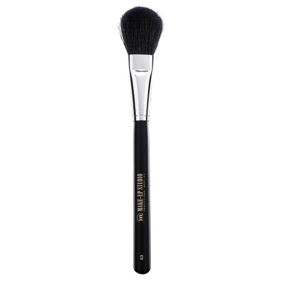 Dit platte blusher penseel met ronding van Make-up Studio geeft een directe mooie blos op de wangen in de juiste vorm. De platte vorm zorgt voor voldoende intensiteit en de ronding zorgt voor een mooi natuurlijk resultaat Dit penseel is gemaakt van geitenhaar.